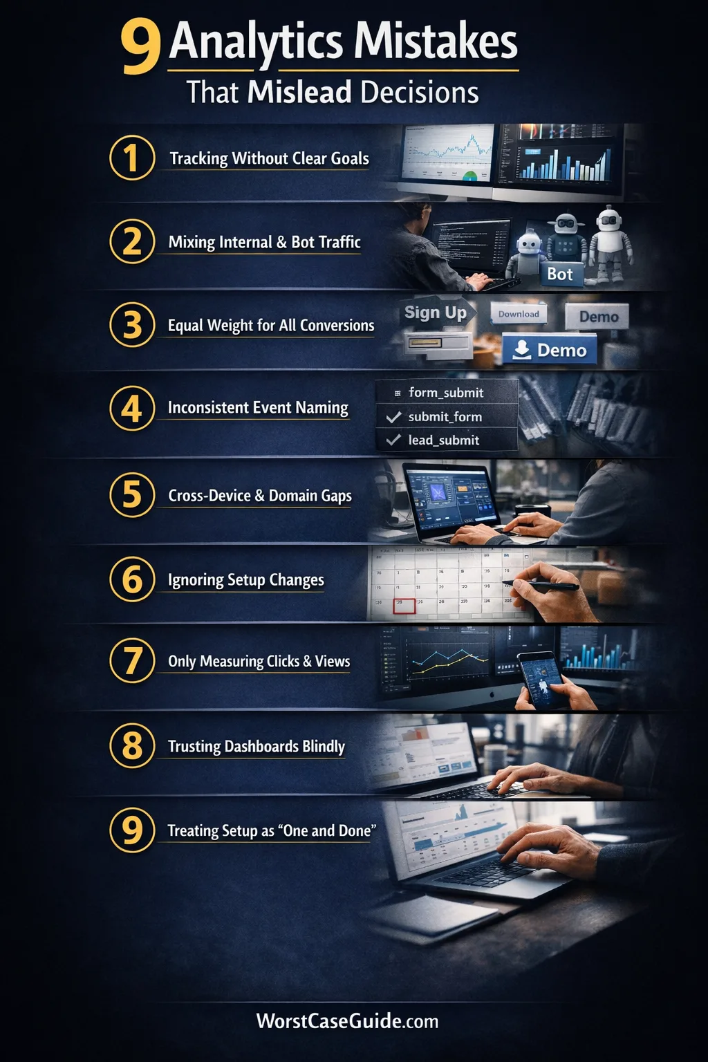 | Undefined goals | Report focus | Many charts, weak decisions | Match every tracked conversion to a business question |