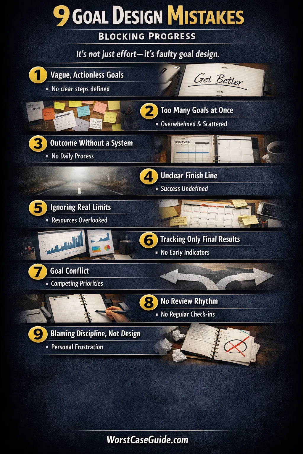 No. Sometimes discipline is part of the picture, though many stalled goals trace back to design errors: unclear finish lines, overloaded priorities, weak measurement, or ignored trade-offs. That is why diagnosis matters.