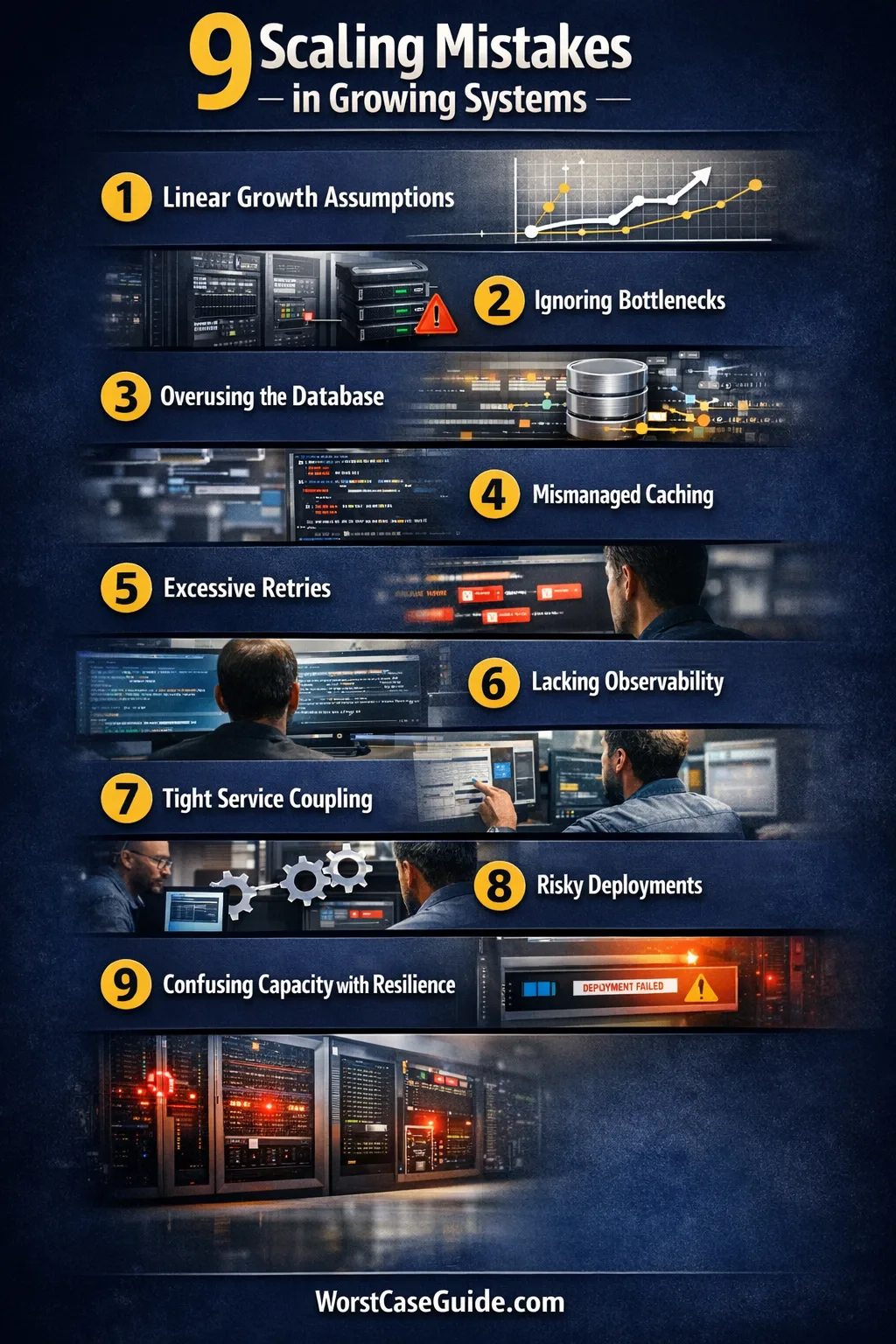 - “More servers fixes it.” Some bottlenecks are single-threaded, stateful, or limited by shared dependencies.